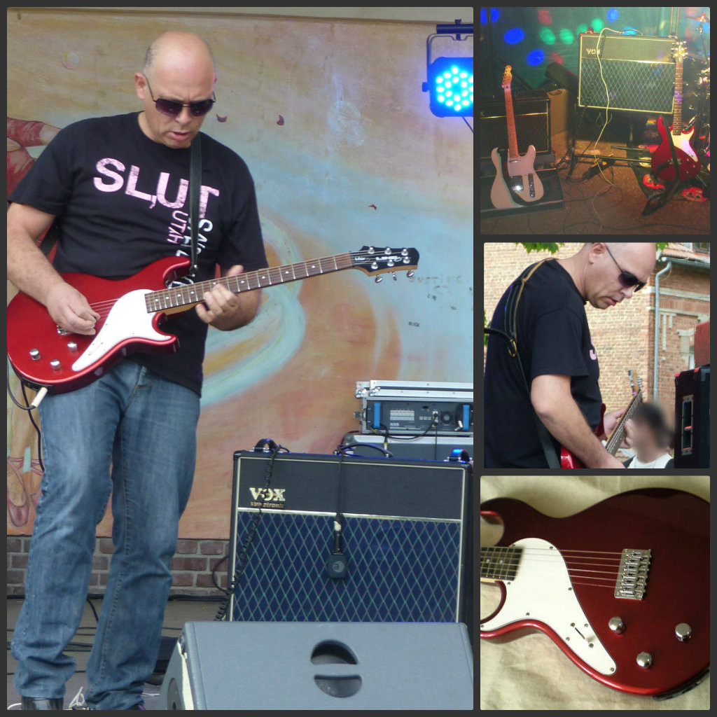 Ces instruments : Une très belle guitare de marque Line 6 Varriax 500, guitare innovante des années 2003, j'adore le charrier à chaque répétition, car cette guitare a une particularité, elle peut recréer par simple rotation de potentiomètres les sons Vintage de 25 différentes guitares mythiques et prestigieuses Fender, Gybsons, etc...! Le miracle de l'électronique d'aujourd’hui ! Je plaisante, mais elle est très performante et s'intègre parfaitement avec le guitariste leader l il s'est bien s'en servir de son manche en érable ! Cette bonne canaille !